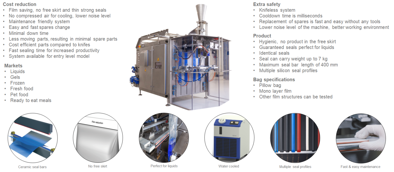 - Optional ceramic sealing bars for improved film use, mono layer film and more safety